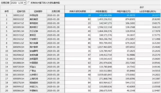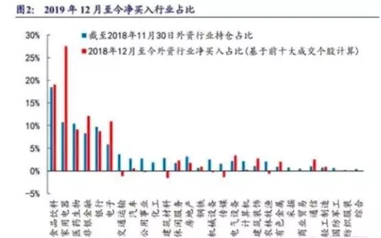 新时代证券分析指出,对比截至2019年11月底外资在行业层面的存量持仓占比与2019年12月至2020年1月10日期间增量外资资金净买入行业占比可以看出:外资前六大重仓行业中,食品、医药、银行的增量资金净买入占比相比存量持仓占比基本持平或略降,家电、非银、电子的增量资金净买入占比则大幅提高。