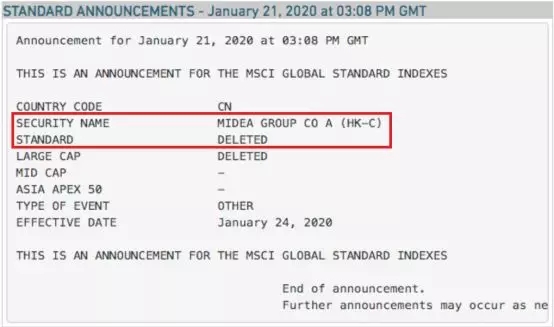 1月22日,全球最大的指数编制公司MSCI也发布公告,将美的集团从MSCI全球标准指数以及MSCI中国全股票指数中剔除,以上变动自2020年1月24日起生效。