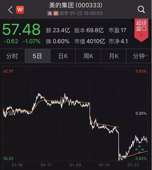 1月21日,截至收盘,美的集团跌3.49%,报58.10元每股;1月22日开盘后再跌3.41%,盘中最低点至56.03元每股。