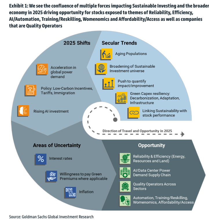 高盛分析团队指出,多种驱动因素将汇聚在一起,影响2025年可持续投资主题和更广泛的美国经济,为其他主题提供顺风车,这包括了可靠性和效率(能源、资源和土地)、人工智能/数据中心电力需求供应链、跨行业的优质运营商、自动化、培训/再培训、女性经济学和可负担性/可及性。
