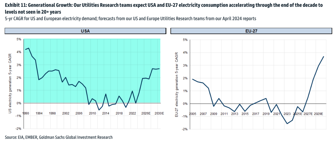 在特朗普政府的有利因素以及电力需求持续上升的背景下,高盛分析师们将关注点转向了美国“基础设施投资不足” 。高盛的公用事业研究团队预计,美国和欧盟27国的电力消费将在2030年前加速,达到20多年未见的水平。