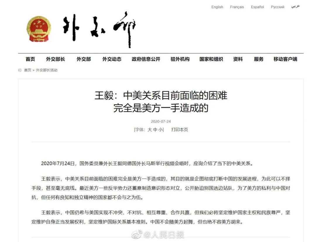 7月24日,国务委员兼外长王毅同德国外长马斯举行视频会晤时,应询介绍了当下的中美关系。