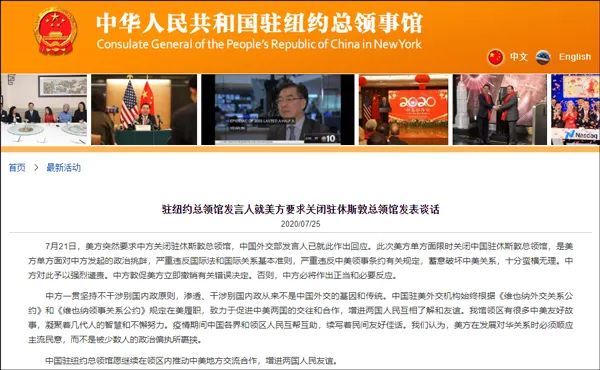 中国驻纽约总领馆网站7月25日消息,驻纽约总领馆发言人就美方要求关闭驻休斯敦总领馆发表谈话。