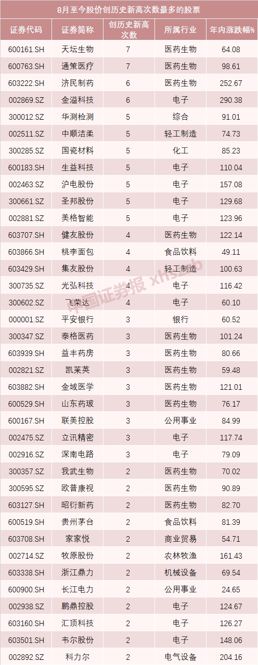 数据显示,8月至今股价创历史新高次数超过2次的有38只个股(剔除今年上市新股),其中来自电子、医药行业的龙头股数量最多,各有12只。前期频创新高的食品饮料行业,仅有贵州茅台和桃李面包两只个股。
