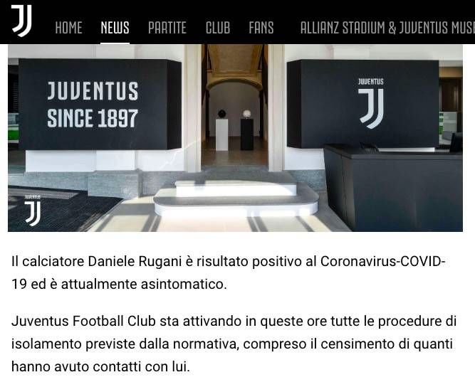 值得注意的是,C罗所在的意甲联赛尤文图斯队官方发布消息,球员鲁加尼确诊为新冠肺炎病例。球员目前还未有明显症状。