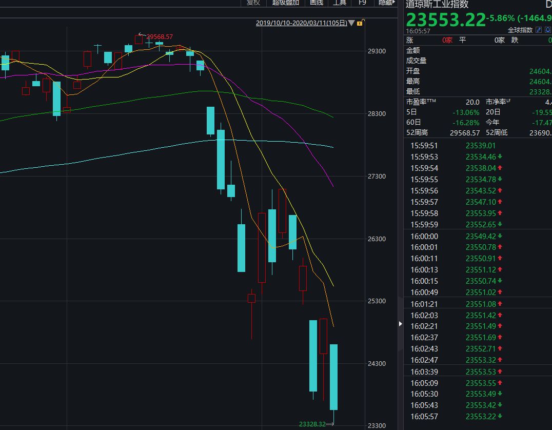 截至收盘,道指跌1464.94点,跌幅5.86%,报23553.22点,陷入技术性熊市。