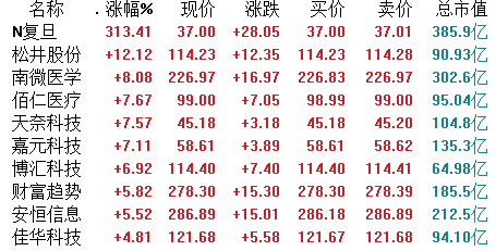 涨幅方面,新股复旦张江(688505.SH)较发行价8.95元大涨313.41%。在新能源板块整体表现活跃的带动下,松井股份(688157.SH)也涨逾12%。此外,昨日遭遇回调的医药板块也有所回暖,南微医学(688029.SH)、佰仁医疗(688198.SH)等跟涨。