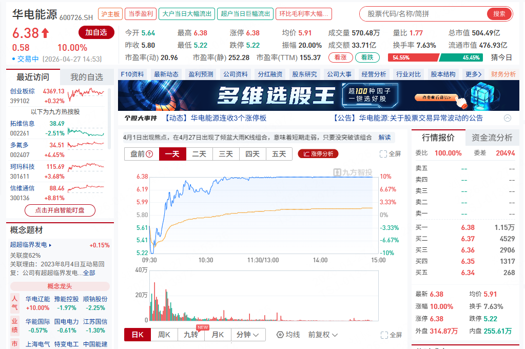 华电能源(600726)27日早盘一度跌停,随后快速回升,午后涨停,上演“地天板”走势。至此,该股已连续3个交易日涨停。