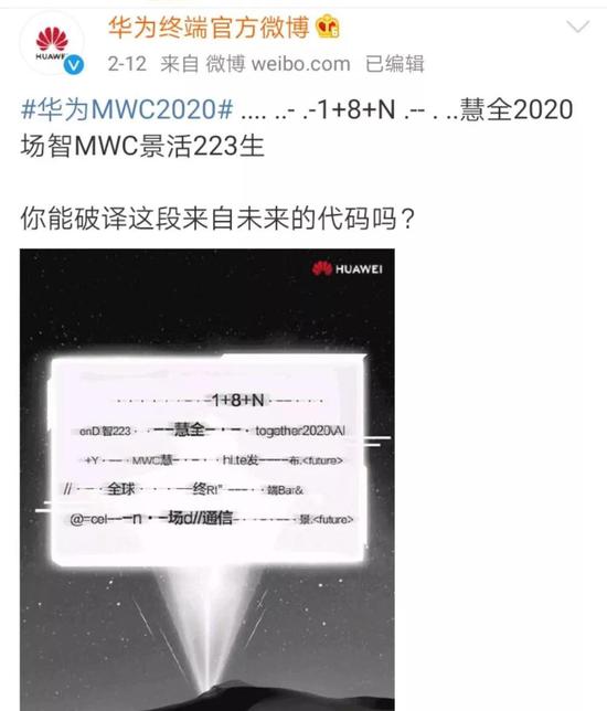 根据此前华为终端官方微博上公布的MWC 2020预热图,华为此次“5G全场景”系列发布会主题是“开启华为全场景智慧生活”,预热图中还出现了一段神秘代码,如1+8+N、5G、通信等。