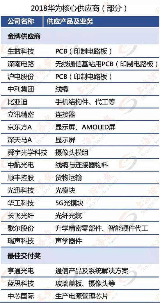 在2018年11月的“2018华为核心供应商大会”上,华为发布了一份包括92家获奖供应商的名单。其中,生益科技、比亚迪电子、京东方A、立讯精密、歌尔股份等多家A股、港股公司获奖。