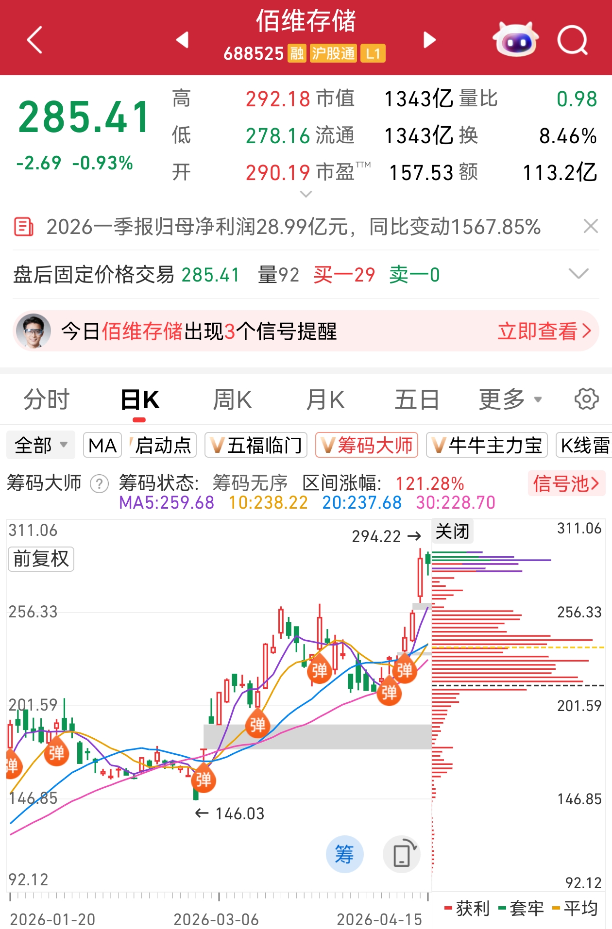 小九注:公司公告称,2026年第一季度实现营业收入68.14亿元,同比增长341.53%;归属于上市公司股东的净利润为28.99亿元,同比扭亏为盈。业绩变动主要系本期业绩大幅增长,主要受益于AI算力爆发,存储行业进入高景气周期,市场需求旺盛推动产品价格持续上涨。2026年公司紧紧把握行业上行机遇,大力拓展全球头部客户,实现了市场与业务的成长突破;公司在智能穿戴等AI新兴端侧领域深耕多年,构建了差异化的竞争优势,随着AI眼镜的放量,公司与Meta等重点客户的合作不断深入,推动公司智能穿戴存储业务的持续增长,2026年第一季度AI新兴端侧存储产品收入约11.75亿元,同比增长496.45%,环比增长53.19%。小财注:公司Q1净利润28.99亿,2025年Q4净利润8.23亿,据此计算,Q1净利润环比增长252%。