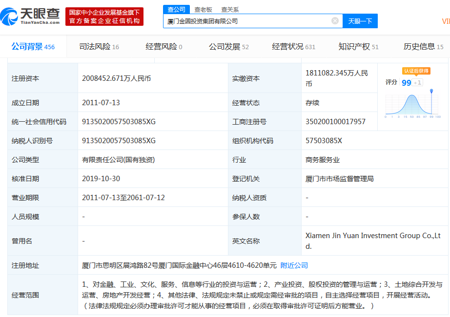 天眼查信息显示,金圆集团成立于2011年7月,注册资本为200.84亿元,法定代表人为檀庄龙,由厦门市财政局100%控股。