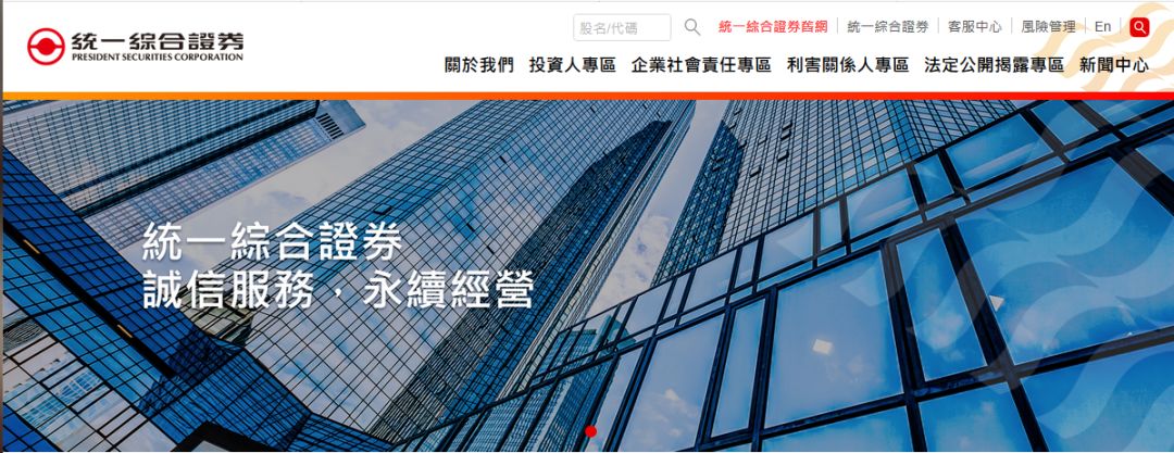 而对海峡对面的台湾人及台商来说,统一综合证券可算是台湾老牌券商之一。早在1988年,台湾地区最大的食品公司统一企业结合了统一超商、长兴化工、诚品实业、台南纺织等厂商,共同创立统一证券。1989年3月更名为统一综合证券,并于同年4月3日正式进入证券市场。1991年9月,统一综合证券一举合并台湾9家专业经纪商,开启台湾证券市场购并风潮。从收入构成看,经纪业务和自营业务具有明显优势。目前,统一综合证券旗下包括统一投信(基金公司)、统一期货、统一投资顾问、统一综合保险代理等机构。