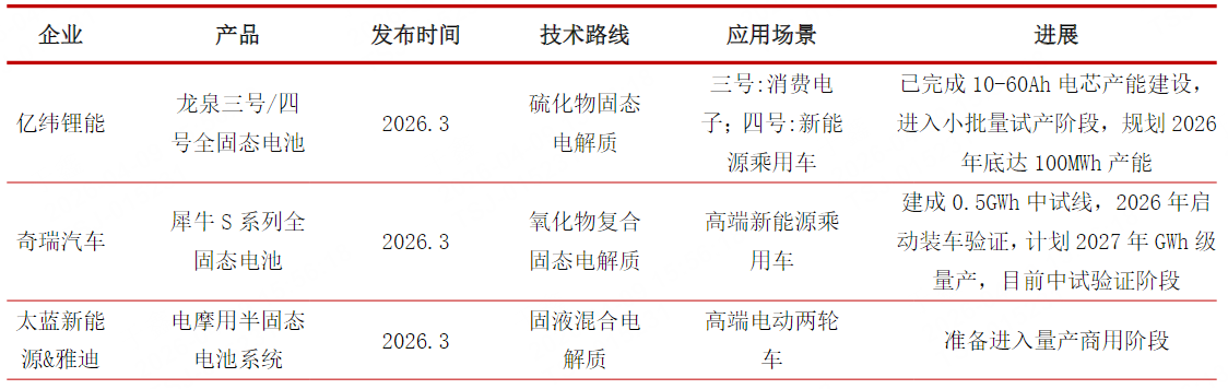 2026年为产业化关键节点,政策多维度支持,头部企业加速中试与量产布局。政策明确固态电池为攻关方向,提供资金与标准支持,多家公司对外展示其固态电池新品,计划2027年后量产,国际企业同步发力。