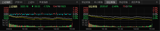 今日三大股指单边下行,截至收盘,沪指跌1.72%,创业扳指跌2.46%,大小指数间的跌幅差别不是很大,市场整体上处于普跌格局。
