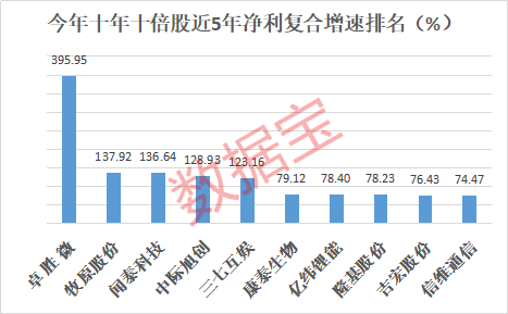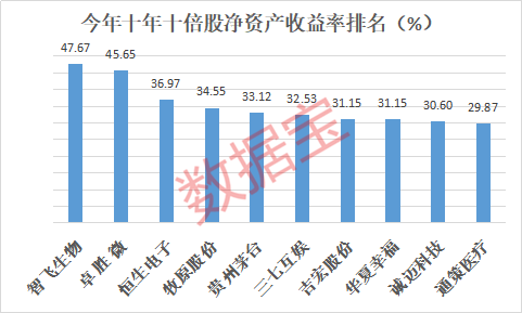 盈利能力方面,今年71只十年十倍股,去年年报平均净资产收益率中位数接近20%,A股市场整体去年净资产收益率中位数为7.5%左右。其中,智飞生物、卓胜微、恒生电子等9只股票净资产收益率超过30%。