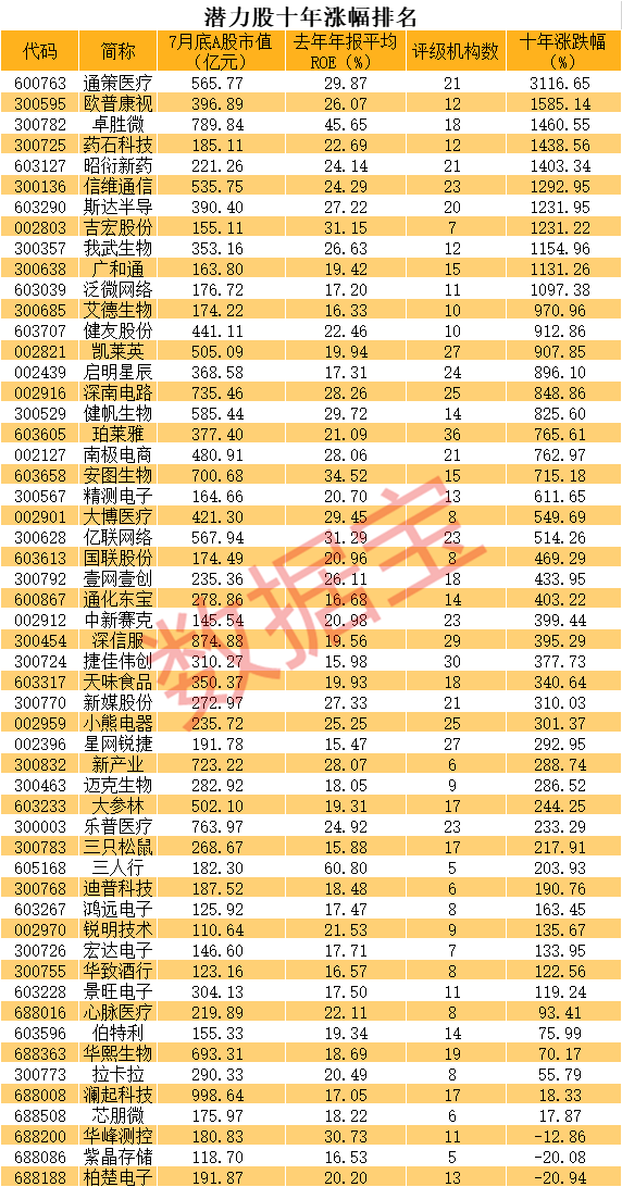 数据宝统计显示,截至7月底,沪深两市A股合计有71只个股十年来涨幅超过10倍。其中,疫苗龙头康泰生物涨幅高达7060.7%位居首位。涨幅第二位的是科技龙头立讯精密,十年涨幅超48倍。涨幅第三位是消费类龙头牧原股份,十年涨幅超33倍。