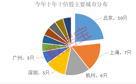 值得一提的是,A股市场十年十倍股还具有较强的地域属性。北上广深杭五个城市贡献了较多的长线牛股,合计有31只股票,占比近44%。其中,北京贡献10只大牛股,上海7只,杭州6只,深圳5只,广州3只。