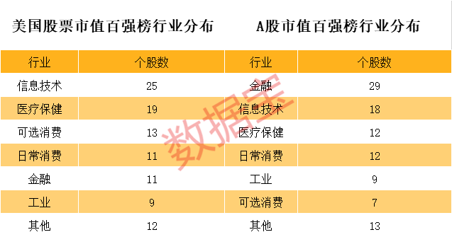 此外,在市值百强榜方面,A股更多的是金融股。数据显示A股市值百强榜中,信息技术行业个股数为18只,医疗保健个股数为,12只,最多的是金融股,为29只;而美股方面(剔除非美国公司),市值百强榜中信息技术行业个股数最多,为25只,医疗保健其次,个股数12只。