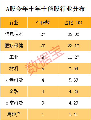 医疗保健、可选消费、日常消费等行业,隶属于大消费板块,信息技术属于科技股。也就是说,今年消费科技股中合计有54只十年十倍股,占比超76%。