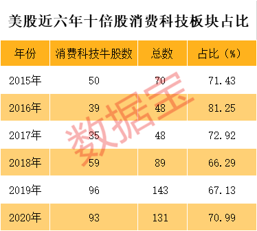 整体来看,美股市场消费科技股十年十倍股占比在七成水平。