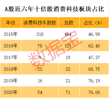 消费科技板块近年来愈发得到市场青睐,也诞生越来越多的长线大牛股。去年和今年两大板块贡献十倍股占比均超76%,显著高于2015年至2018年。