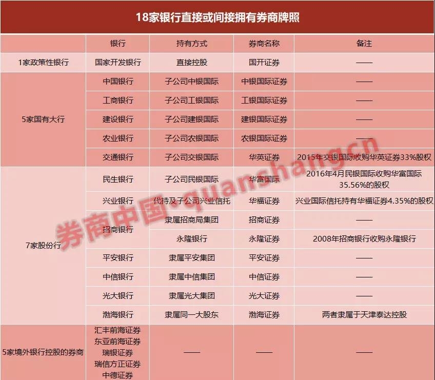 以最近闹得沸沸扬扬的“商业银行将持券商牌照”一事来说。据统计,目前共有18家银行直接或间接拥有券商牌照(含在港中资券商,其中5家为境外银行控股、13家为境内银行控股),但无一家地方性银行。