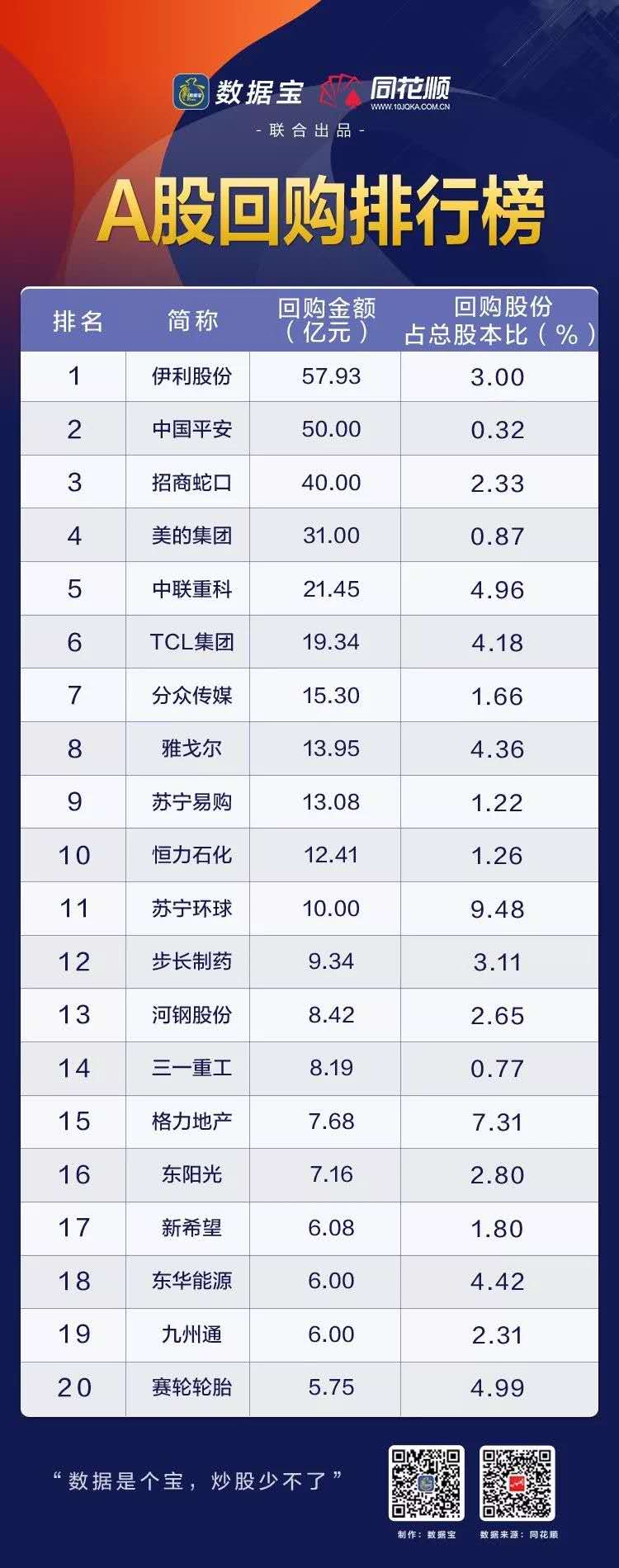 仅以今年以来发布预案的公司来看,130家公司实施回购金额超过1亿元,占比37%。数据宝与同花顺联合发布的2019年《A股回购排行榜》显示,上榜的50家公司全年回购金额均超过1.5亿元。伊利股份、中国平安(601318)、招商蛇口(001979)、美的集团(000333)、中联重科(000157)等11股回购金额超过10亿元。