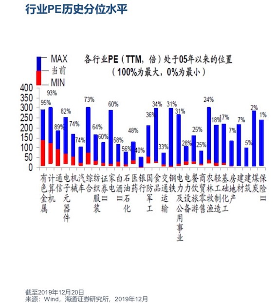 根据海通证券研究所的报告,就各行业PE处于2005年以来的位置(100%为最大,0%为最小)而言,计算机处于93%,通信89%,电子元器件82%,家电60%。相比之下,房地产则为7%,建材7%,建筑5%。