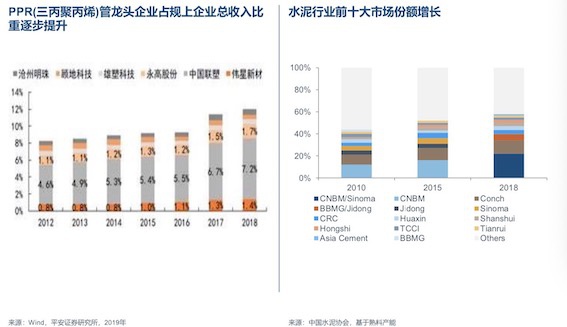 “具体而言,水泥和PPR(三丙聚丙烯)管材,这两大子行业的前五大的市场份额在过去的六、七年持续提升,尽管提升速度比较慢,总体来说前五大现在的市场份额还是10%,仍是一个非常分散的行业,因此市场份额提升空间很大。”周文群说。