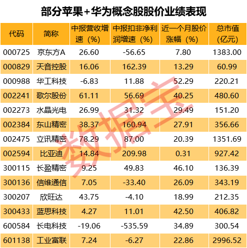 证券时报·数据宝统计,当前A股身兼苹果+华为双概念的个股共有14只,近一个月来股价平均涨幅达27%,大幅领跑两市。未来受益于智能手机新一轮换机周期的到来,相关个股有望迎来新一轮行情。