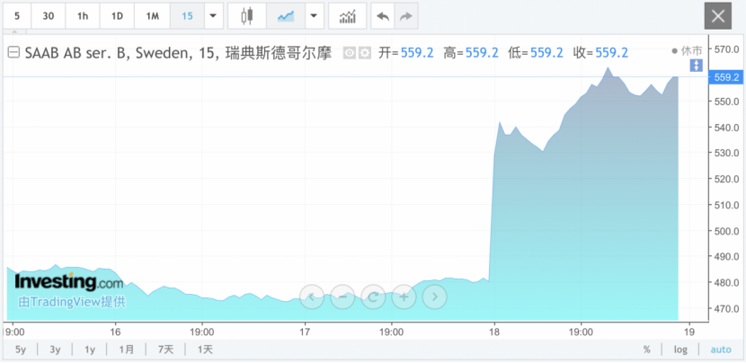 当地时间7月18日,欧股股市开盘后,萨博(Saab)股价狂飙,一度暴涨超17%,刷新历史最高纪录,截至收盘,涨幅达16.43%,年初至今该股股价已累计暴涨超139%。