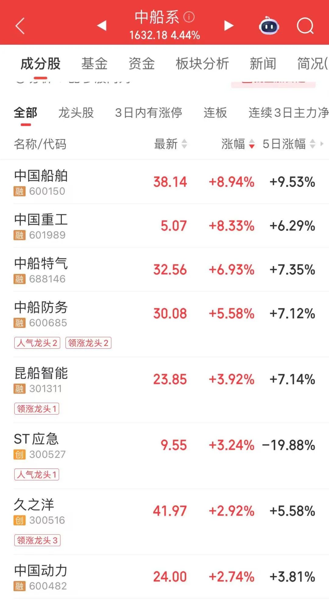 今天上午,中船系板块上涨,中国船舶(600150)上涨8.94%,中国重工上涨8.33%。
