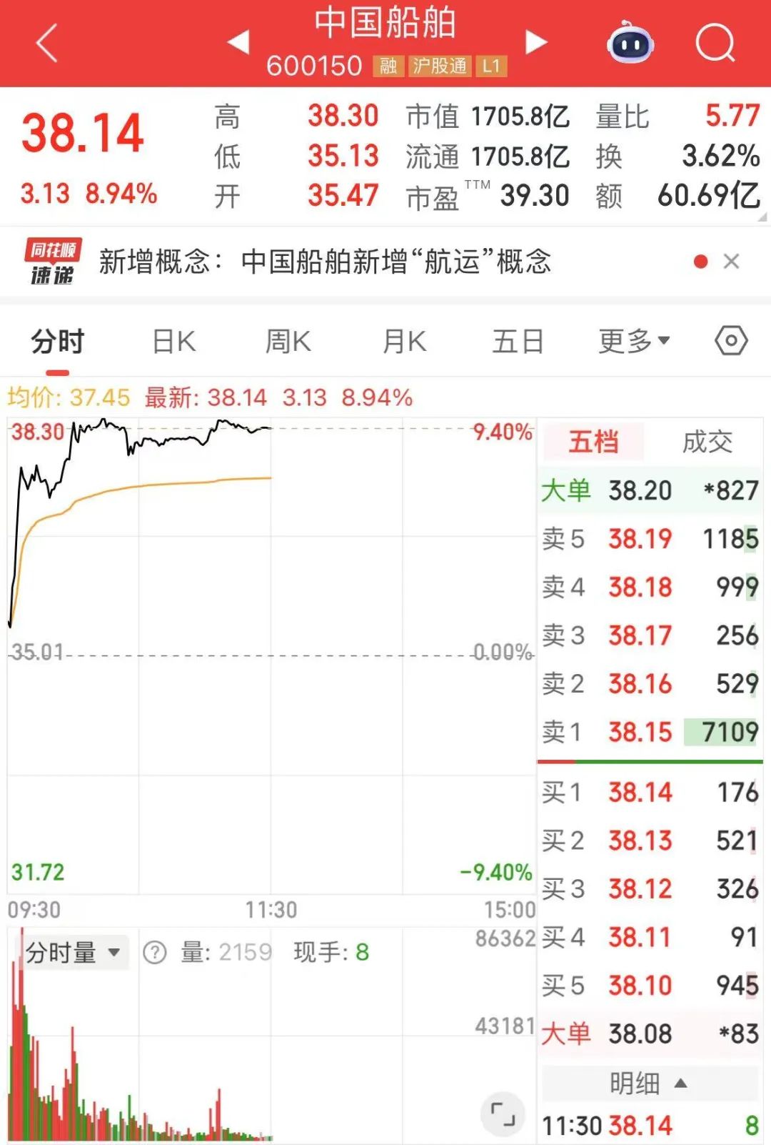 受利好消息催化,中国船舶(600150)半日上涨8.94%,总市值为1705.8亿元,半日交额为60.69亿元,居全市场第一。