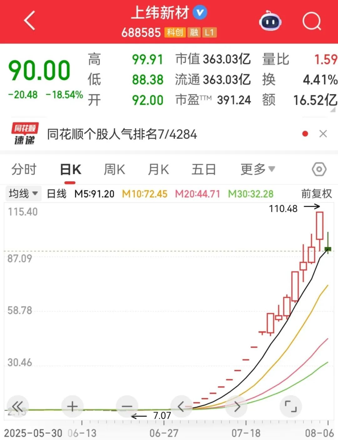 上纬新材上午大跌18.54%,盘中触及跌停。该股自7月9日以来的17个交易日,累计大涨超13倍。
