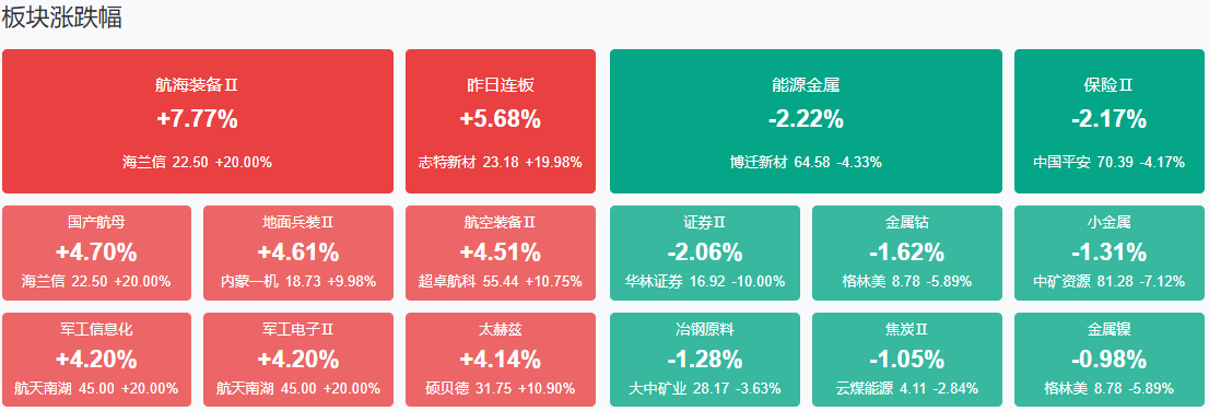 板块题材上,商业航天、军工、脑机等板块涨幅居前;能源金属、保险、证券等板块跌幅居前。截至收盘,沪指跌0.07%,深成指跌0.51%,创业板指跌0.82%。