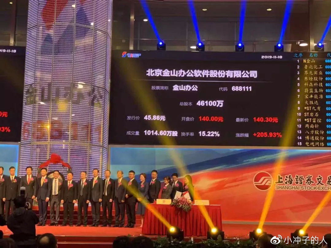金山办公证券代码为688111,发行价格45.86元/股,发行市盈率为78.37倍。鸣锣开盘后,金山办公股价高开逾205%,股价报140元/股。