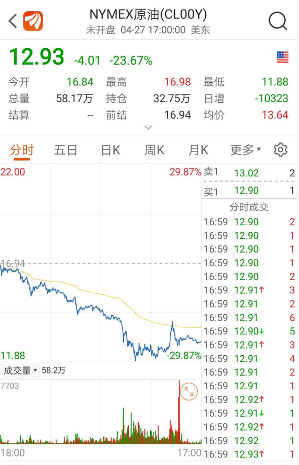 此外,NYMEX原油也同样下跌超23%,报收12.93美元/桶。