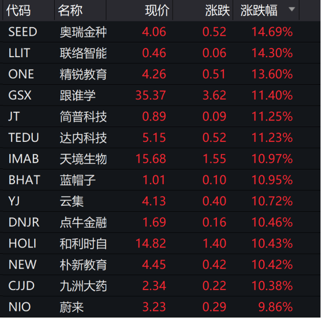 热门中概股涨跌不一,阿里巴巴跌0.34%,京东涨1.18%,百度跌0.39%,拼多多涨3.27%,蔚来汽车涨9.86%。中概教育股集体上涨,精锐教育涨13.60%,跟谁学涨11.40%,尚德机构涨9.04%。