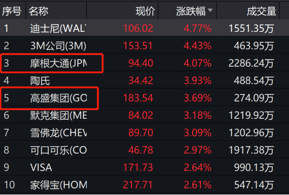 金融股领涨市场,其中摩根大通涨4.07%,高盛涨3.69%,花旗涨8.00%,美国银行涨5.68%,富国银行涨5.57%,摩根士丹利涨3.53%。