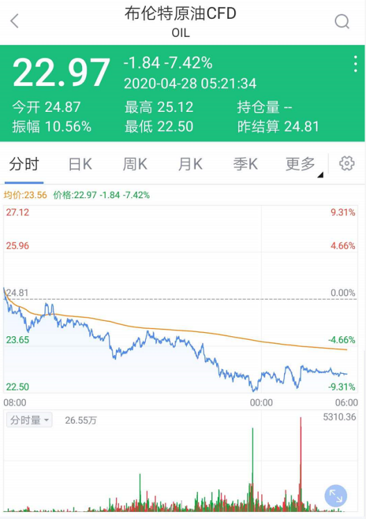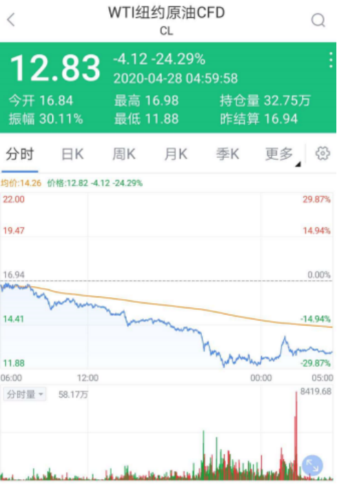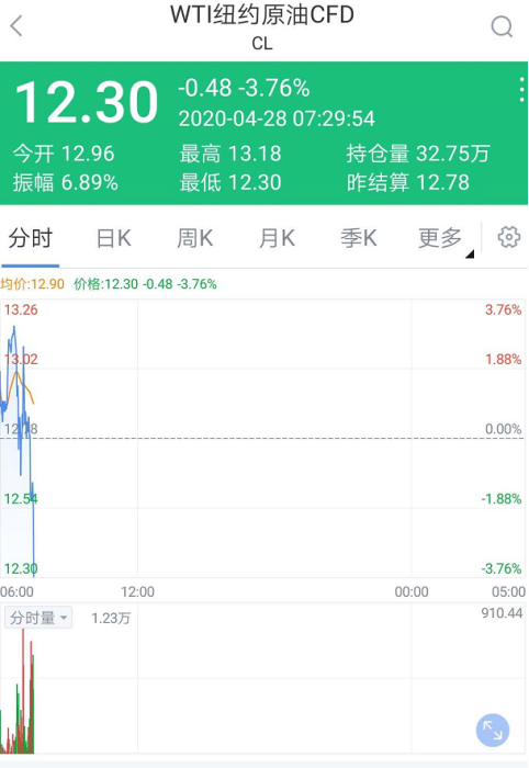 隔夜市场收盘,WTI原油6月期货暴跌近25%,盘中一度重挫30%,至12美元/桶关口下方。7月份交割的布伦特原油期货下跌超7%。4月28日清晨开盘,截至7点30分,WTI原油再度下跌,跌幅超3.76%。