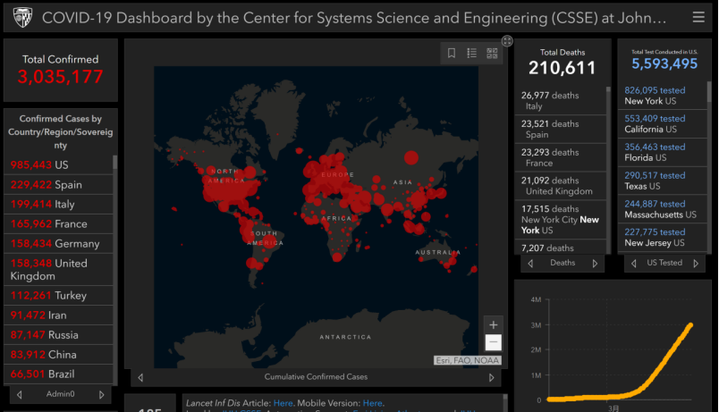 不过目前,全球疫情仍在持续蔓延。据美国约翰斯·霍普金斯大学4月28日6点30分数据,全球确诊人数逼近303万,死亡人数增至21万。