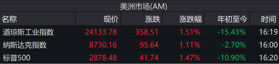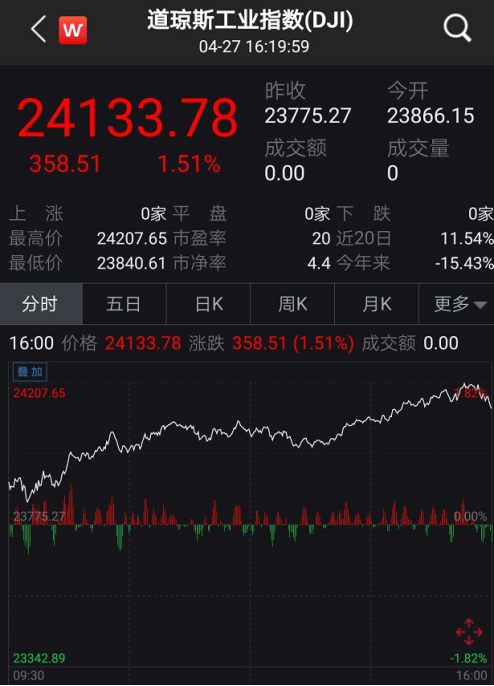 4月28日凌晨美股收盘,道指上涨358.51点,或1.51%,报24133.78点;纳指涨95.64点,或1.11%,报8730.16点;标普500指数涨41.74点,或1.47%,报2878.48点。