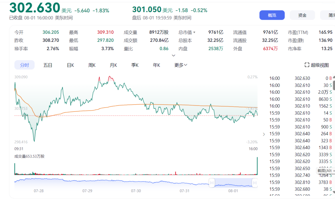 特斯拉股价8月1日下跌1.83%,报收302.63美元。