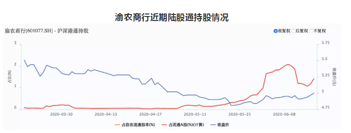 5月23日,北向资金持有渝农商行比例为0.3181%,6月17日这一数值变为1.4187%,期间增加了3.46倍。北向资金提前埋伏渝农商行的情况似乎更加明显。