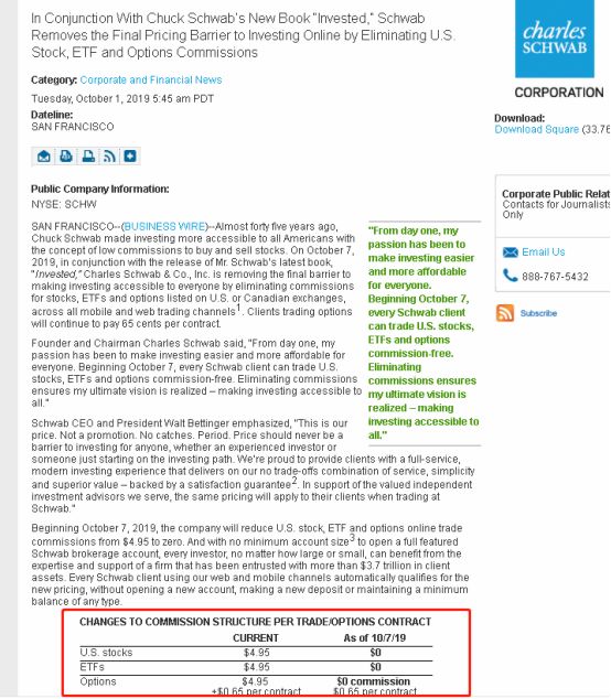 去年10月1日,美国最大线上证券经纪商之一的嘉信理财(SCHW)在其官网宣布:从今年10月7日起,公司将完全取消美国和加拿大上市股票、ETF和期权的线上交易佣金。