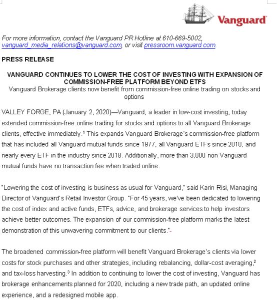1月2日,美国最大共同基金及ETF巨头先锋领航集团(Vanguard集团)宣布,将取消股票交易佣金,加入了其他同业经纪公司的行列。当天,基金君也向接近先锋领航集团相关人士确认了上述消息的真实性。