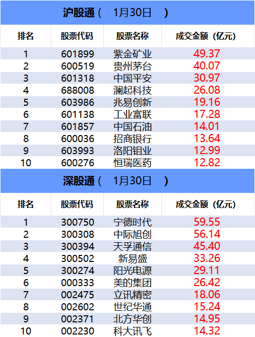 从沪股通前十大成交个股来看,紫金矿业位居首位;贵州茅台和中国平安分居二、三位。