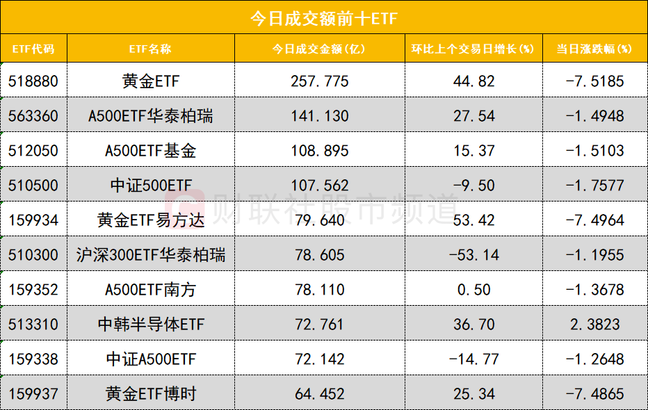 从成交额前十的ETF来看,黄金ETF(518880)成交额位居首位,A500ETF华泰柏瑞(563360)成交额位居次席。