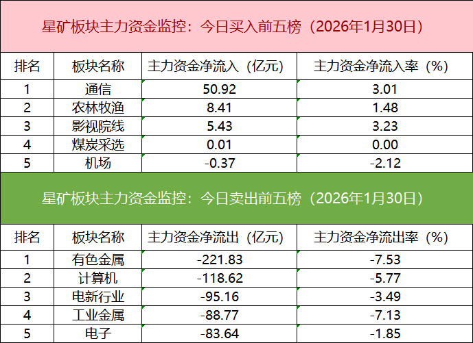 从主力板块资金监控数据来看,通信板块主力资金净流入居首。